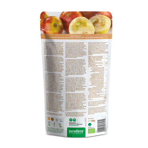 Purasana camu camu poudre contient 100 % de camu camu cru, sans aucun additif supplémentaire. Le produit est certifié biologique, végétalien et casher, il est également exempt des allergènes gluten et soja.