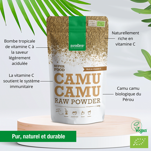Une portion de poudre de camu camu fournit presque 300 % de l’apport journalier en vitamine C. C’est précisément parce que le camu camu est si riche en vitamine C que les baies sont populaires en Amérique du Sud pour raccourcir la durée des rhumes.