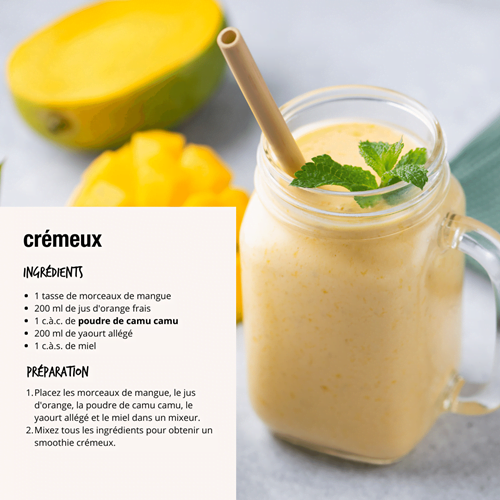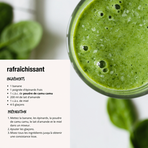 Ajoutez 5 g de poudre de camu camu à 300 ml de jus, de boisson de riz ou d’avoine. Pour un effet surprenant, ajoutez une mesure de poudre de camu camu aux smoothies, aux desserts ou aux yaourts.